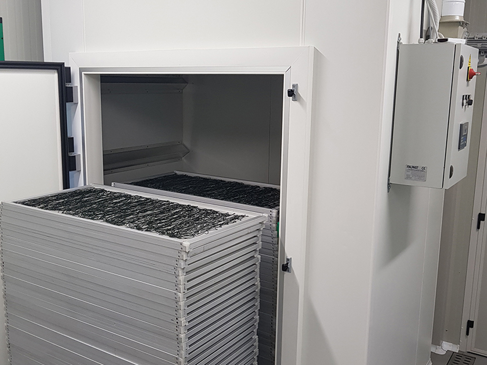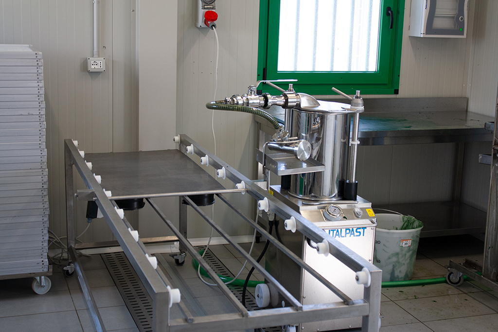 Gli spaghetti sono filamenti molto sottili dal diametro di 2 mm che vengono adagiati su di una intelaiatura che poi verrà riposta nell’essiccatore.
